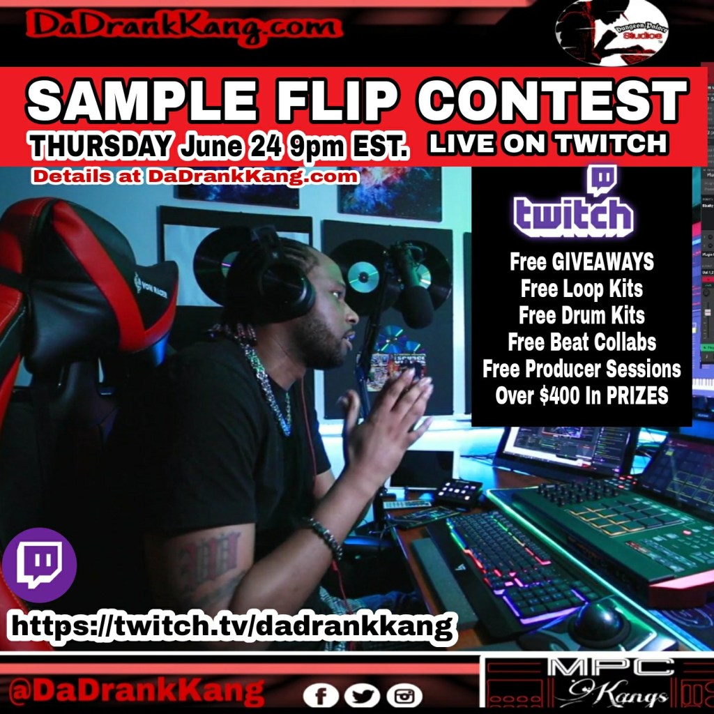 FIRE UP YOUR STUDIOS AND GET READY TO MAKE BEATS LIVE!! This will happen all on Twitch LIVE… JUST SHOW UP! All contestants will be given 1 sample loop to download live on Twitch. You will have 1 hour to create and submit only 1 beat in MP3 format. All genres of music are accepted. All beats will be played LIVE on Twitch after the 1 hour time limit. Prizes and giveaways will be given to the hottest beats! DISQUALIFICATIONS: submitting more than one beat, not using the sample given, beat not submitted in 1 hour, beat not in .mp3 format