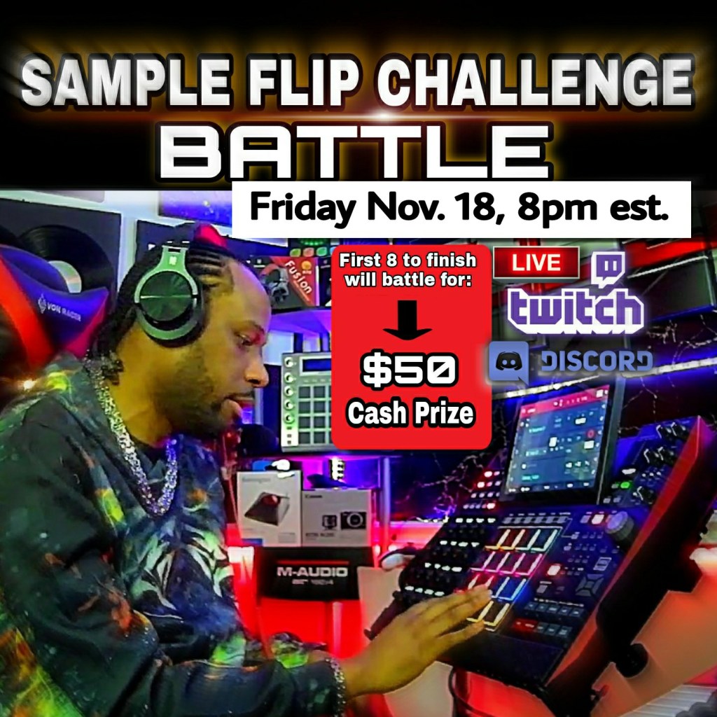 Pull up on Twitch LIVE for the sample flip challenge! 1 hour to make a beat LIVE. Cash prize will be given to the best beat! Come have some fun and test your skill on the clock!