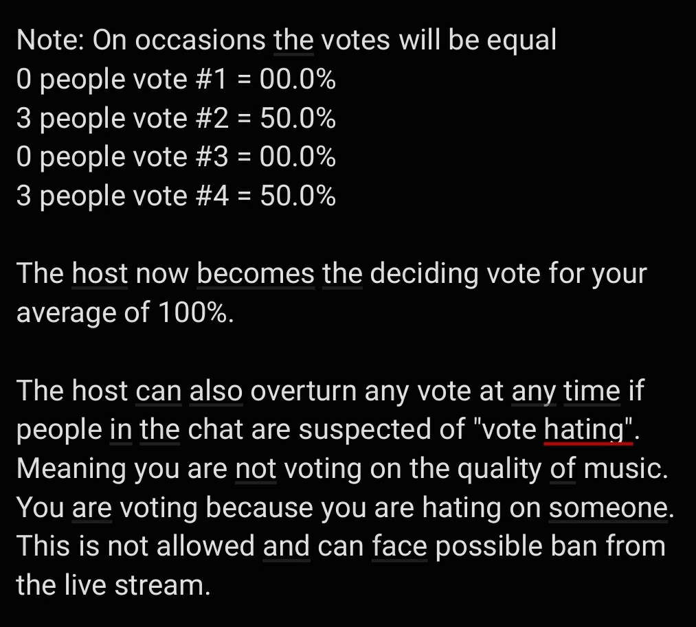 Your goal in the beat battle is to get the best over all average out of 100% in the top category. This means that all votes no matter how many or what rating is chosen will equal 100% at all times. The poll will always use the total number of votes as the 100% goal.