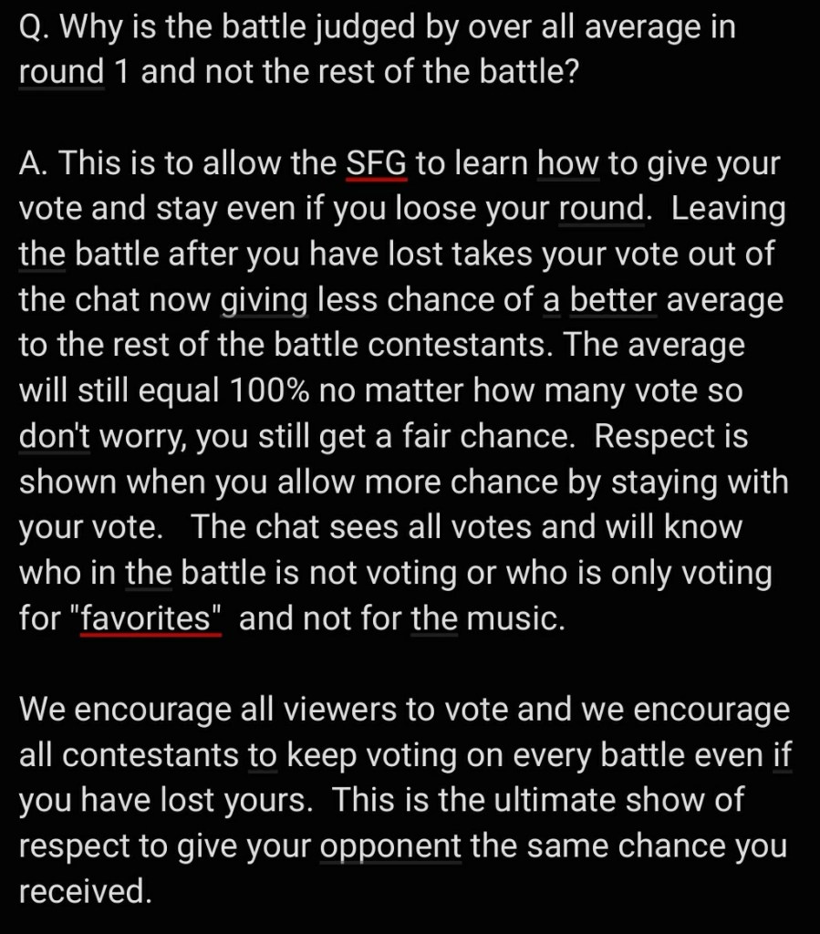 All twitch events by the Stank Face Gang are geared towards learning and showing respect first. Fun comes second. It is very easy to show up and have fun anywhere, but the SFG would like to see, win or loose, who shows up with respect first before the fun and stays active. The first round of the battle is your opportunity to do this. Thank you to all who join our events and can see what is being done!
